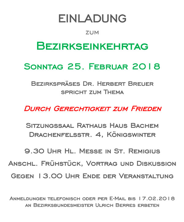 25.02.2018 - Bezirkseinkehrtag in Königswinter (09:30 Uhr, St. Remigius, anschl. Haus Bachem)